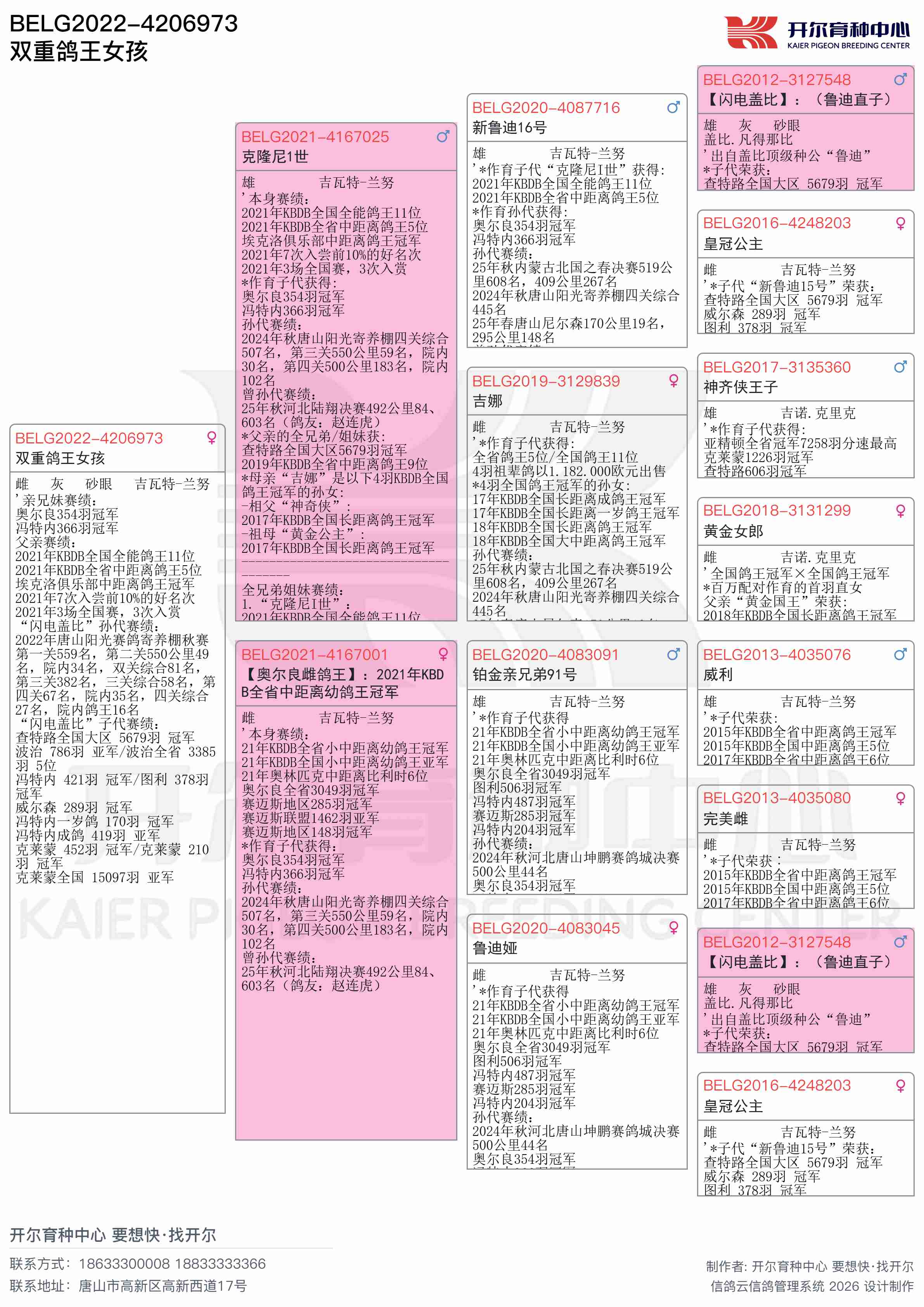*母亲“吉娜”是以下4羽KBDB全国鸽王冠军的孙女: