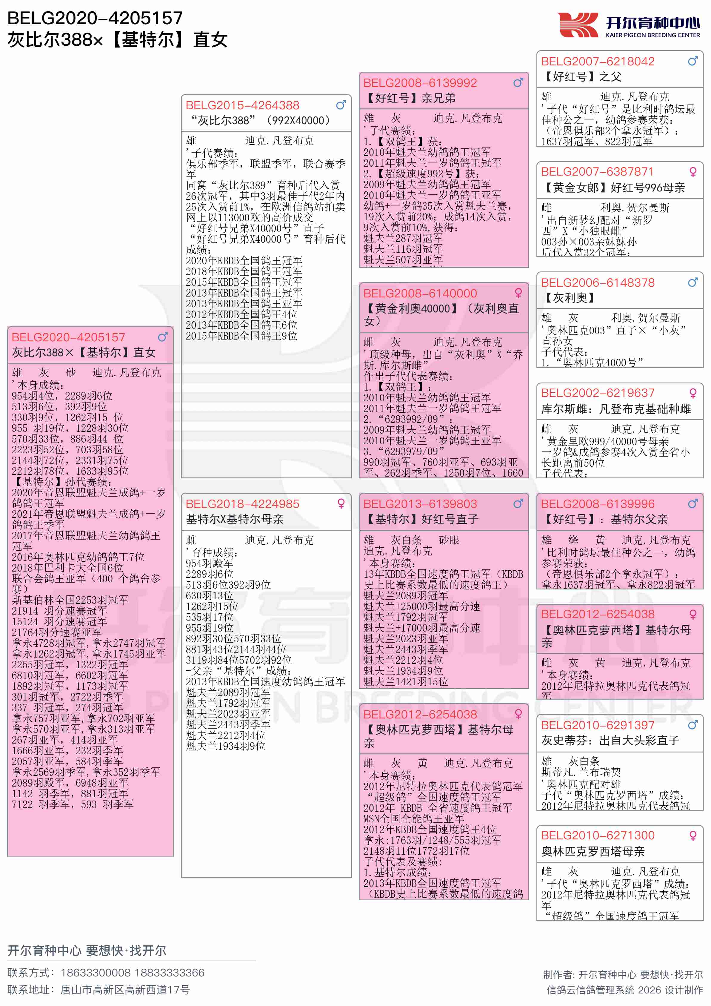 同窝“灰比尔389”育种后代入赏26次冠军,其中3羽最佳子代2年内25次入赏前1%,在欧洲信鸽站拍卖网上以113000欧的高价成交