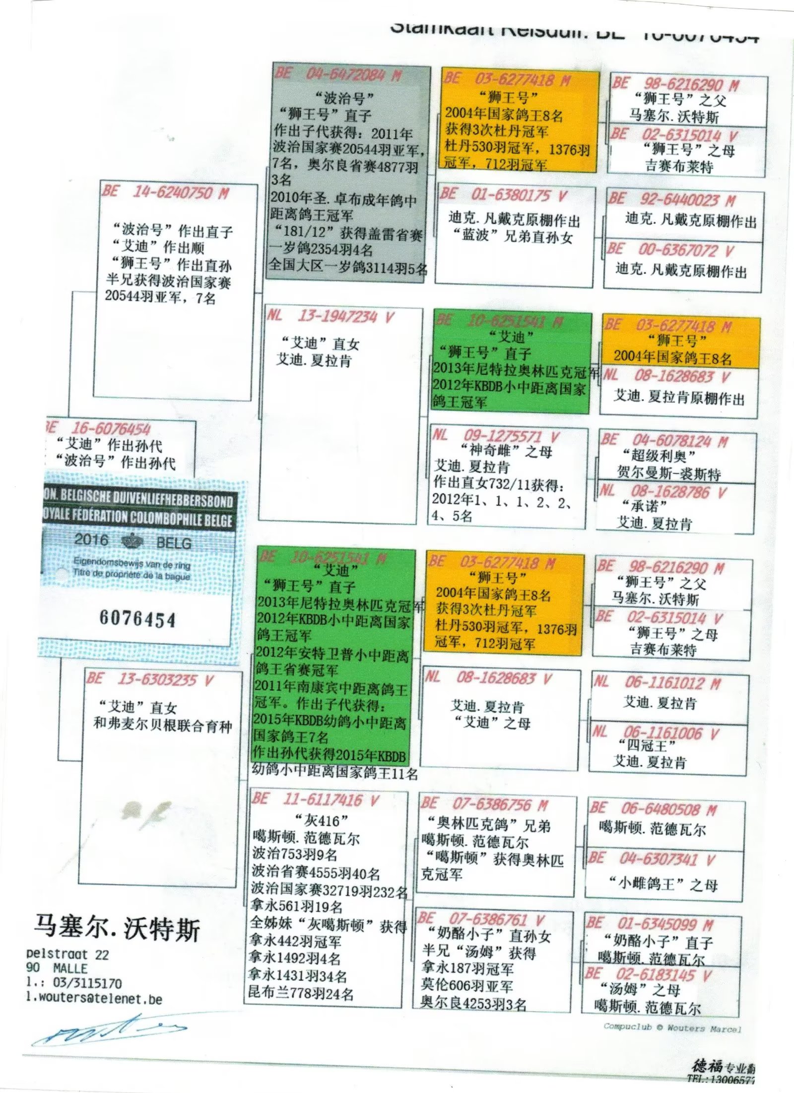 2011年南康宾中距离鸽王冠军。作出子代获得: