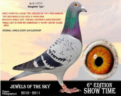 NL08-1102719 直女获12年市会大奖赛7名、13年500km67名/550km16名,孙女获13年江苏电视台公棚预赛89名/决赛67名 ● 父:NL00-1925122 “帝普士”,斑,当今的传奇种公,出自“小迪克”直子同“小迪克”全姐妹的近血配对 ●母:NL01-1135560 “高贵女郎”,斑,考夫曼原舍原舍雌鸽,出自神奇王牌“爱玛文先生”