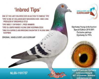 NL2008-1101757 出自传奇鸽“帝普士”X神奇雌鸽“塔拉” 直女获16年春天平公棚决赛324名 ● 父:NL00-1925122 “帝普士”,斑,当今的传奇种公,阿拉丁直子,出自“小迪克”(子x全妹)的近血配对 “帝普士”作出不下9羽冠军!优秀子代代表及佳绩 ● 母:NL03-1731818 “塔拉”,斑,考夫曼父子原舍鸽,出自“小迪克”X“爱蜜拉