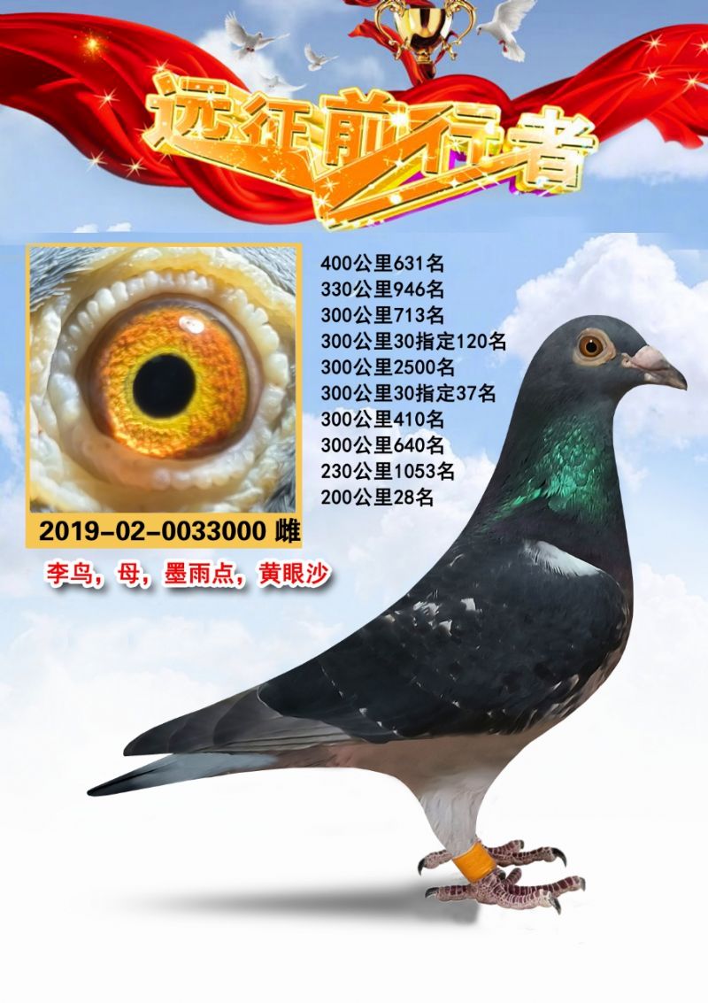 李鸟,母,墨雨点,黄眼沙,手感肌肉好,2019-02-0033000,血统纯正,天津地方赛羽色(黄雄灰),介意勿扰,成绩保真,喜欢的来,包邮,不讲价。