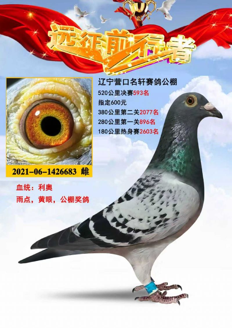 利奥,雨点,母,黄眼沙,公棚成绩鸽,2021-06-1426683,手感肌肉好,血统纯正,成绩保真,喜欢的来,包邮,不讲价。