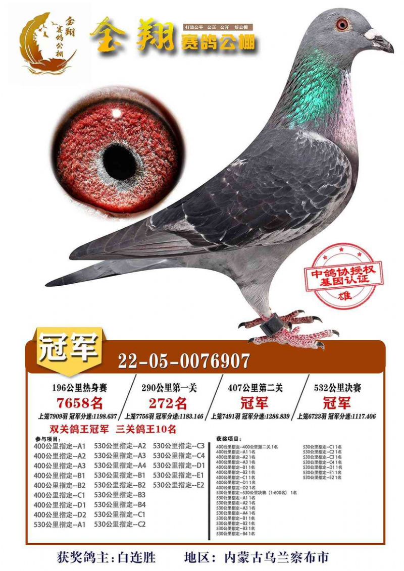 唐山阳光三关鸽王冠军