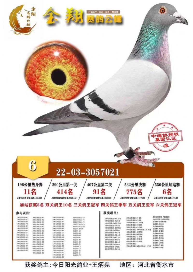 唐山阳光三关鸽王冠军
