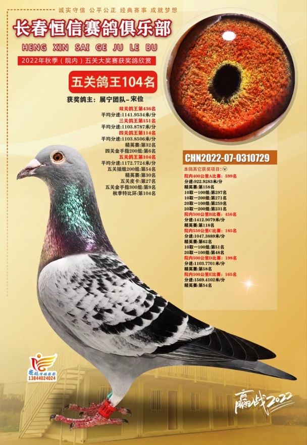 双关鸽王第436名 平均分速:1141.9534米/分 三关鸽王第151名 平均分速:1103.8787米/分 四关鸽王第114名 平均分速:1103.8506米/分 精英赛◇第32名 四关金手指200组◇第6名 五关鸽王第10名 CHN2022-07-0310729 平均分速:1172.7724米/分 五关插组200组:第54名 本鸽其它获奖项目:V 精英赛:第30名 院内400公里A比赛:599名 五关皮卡:第27名 分速:922.9283米/分 五关金手指300组:第9名 精英赛:第158名 秋季特比环:第104名