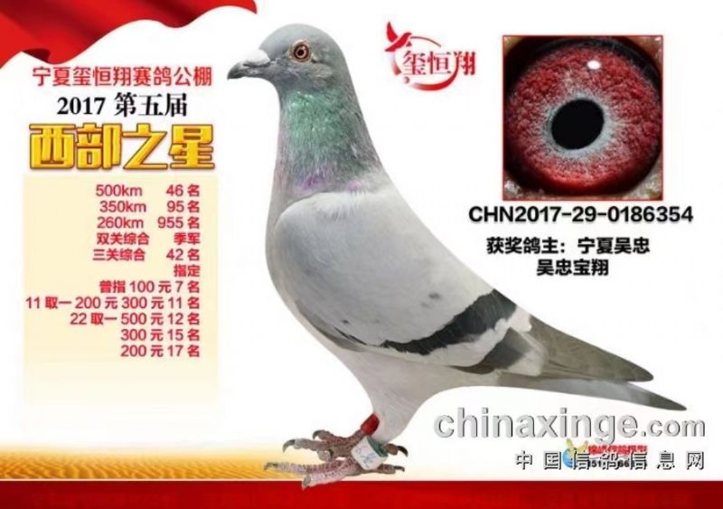 功勋种雄桑杰士鸽王季军,本身宁夏玺恒翔公棚决赛46名,双关鸽王季军 直子:19-0083264,2019甘肃平凉卓越赛鸽公棚决赛70名,70名作育24-1778248张家口盛世达赛鸽公棚决赛5名、25-0515242张家口鸿盛赛鸽公棚决赛887名、25-0515213张家口盛世达赛鸽公棚决赛612名等直女:24-1778222天津华顺德赛鸽公棚决赛16名,16名作育25-0515227张家口泰达赛鸽公棚决赛486名等以上是这羽功勋鸽近两年作育成绩,之前还有很多不一一介绍。