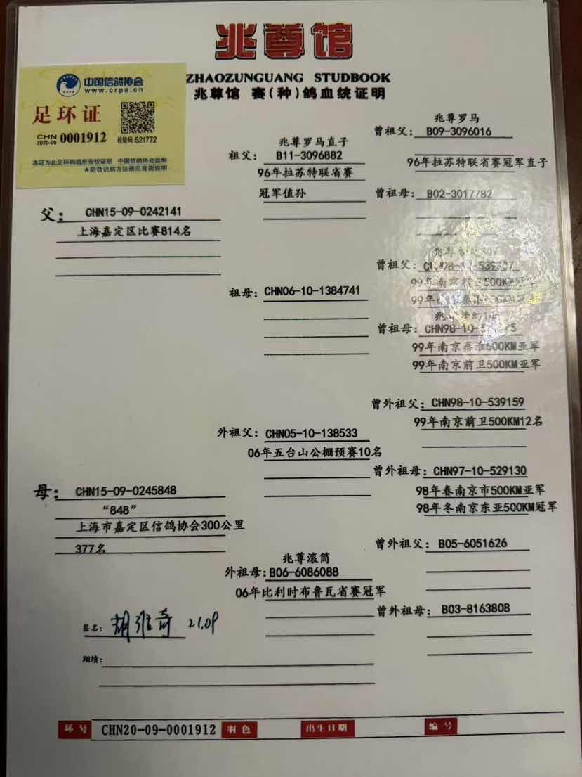鸽 名: 兆尊馆原舍 兆尊苍白