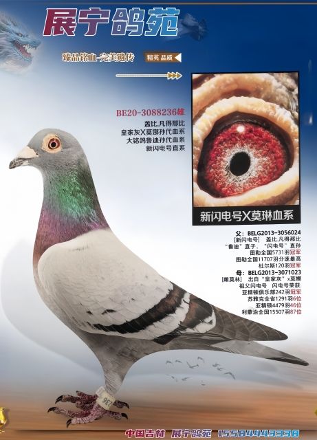 新闪电号X莫琳血系 父:BELG2013-3056024[新闪电号] 盖比.凡得那比"鲁迪"直子,"闪电号"直孙 图勒全国5731羽冠军图勒全国11707羽分速最高 杜尔斯120羽冠军 母:BELG2013-3071023 [雌莫林] 出自"皇家灰"x莫娜 祖父闪电号 闪电号荣获:亚精顿俱乐部242羽冠军苏雅克全省1291羽6位亚精顿4479羽46位利蒙治全国15507羽87位