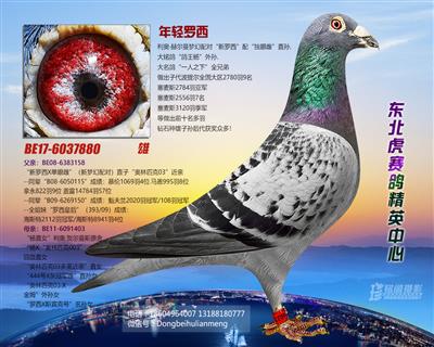 “年轻罗西” BE17-6037880 斑 砂眼 雄 利奥·赫尔曼梦幻配对“新罗西”配“独眼雌”直孙. 大铭鸽“鸽王杨”外孙. 大名鸽“一人之下”全兄弟 做出子代波提尔全国大区2780羽9名 塞麦斯2784羽亚军 塞麦斯2556羽7名 塞麦斯3120羽季军 等做出前十名多羽 钻石种雄子孙后代获奖众多! |