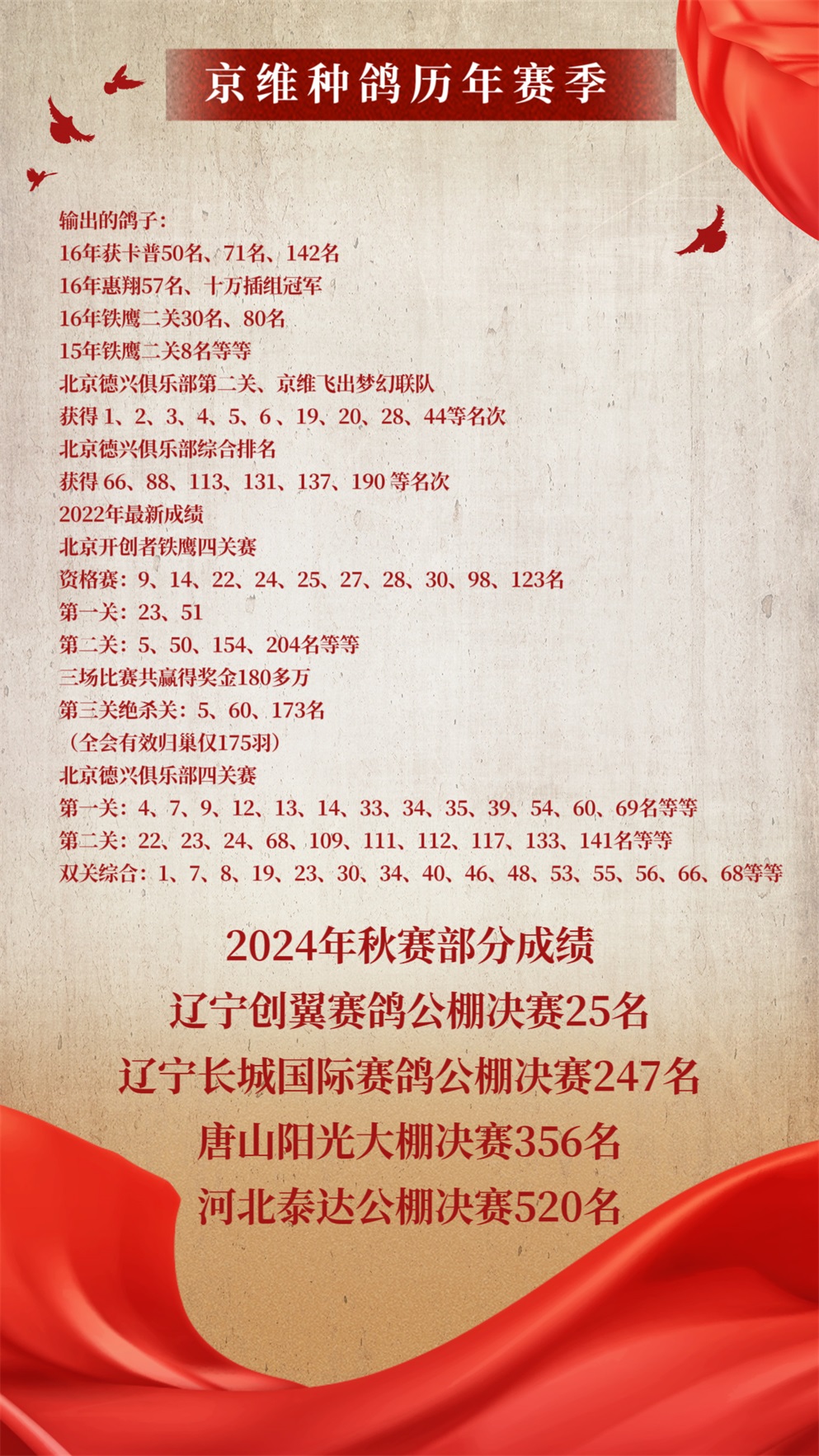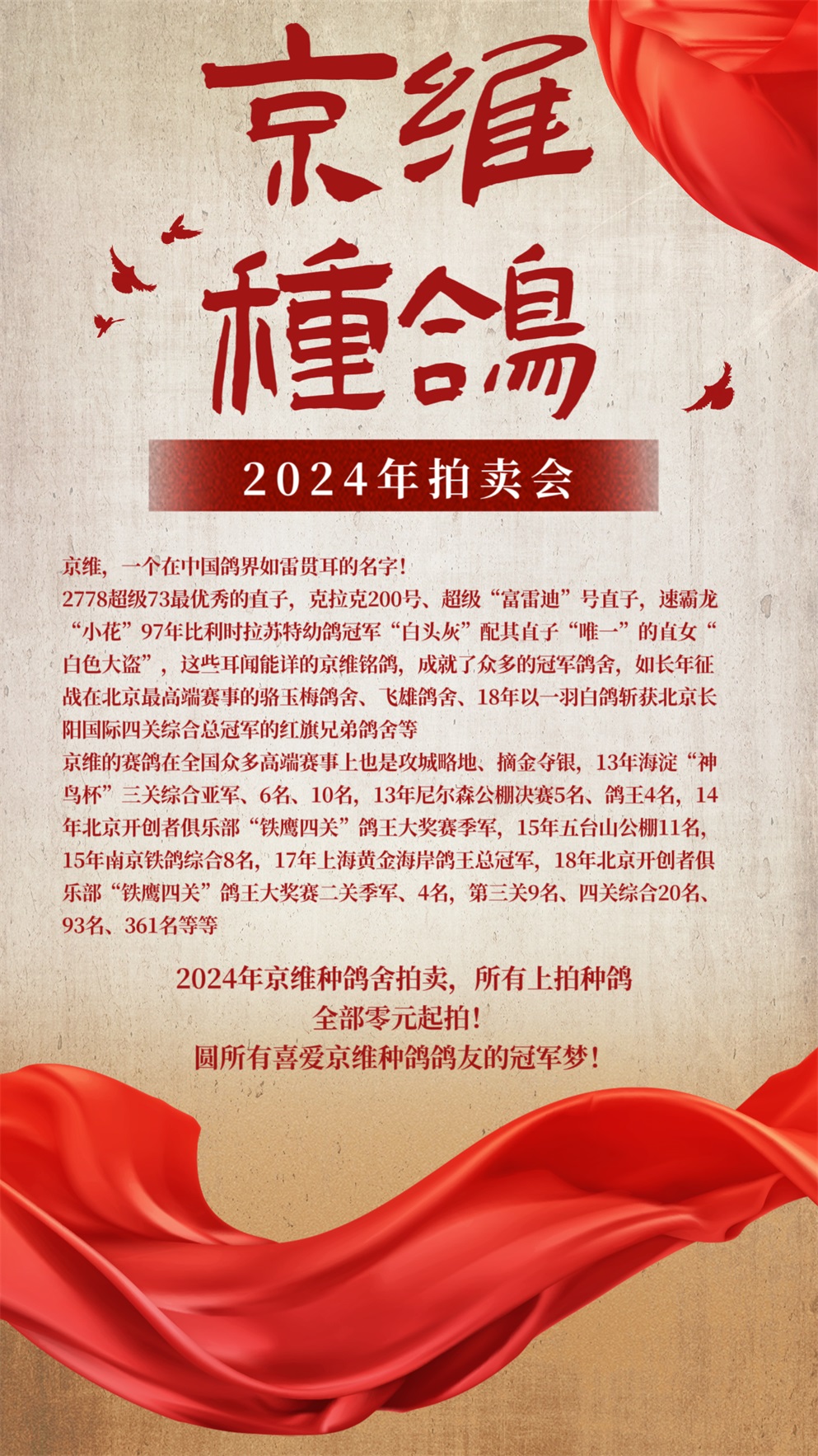 拍卖说明: 1.先注册中信网会员名,通过中信网拍卖保证金认证(缴纳1000元保证金),详情请参考拍卖帮助中心,http://help.ag188.com。(中信网会员区拍卖认证资料管理栏目操作)为保证人能够拍卖者权益,请使用会员账户支付! 2.参拍出价前请先确认您需要到达的运输地点,然后电话跟我们确认是否可以运达,以免得标后因无法运达而造成不必要的纠纷,运输方式电话:13693007901 3.运输费用:拍卖运费请加微信直接支付北京首航托运公司,微信号:13693007901,汽运及火车运输:按次数计算,每次200元,得标4羽内(含4羽)按200元计算,每增加一羽加价50元。空运:按次数计算,得标4羽内,每次按600元支付,增加一羽加价50元,如需中转加150元中转费。鸽友需自行到指定机场或可到达之长途车站取鸽。 4.拍卖过程中,如出现网络异常情况(需经中信网核实认定),北京京维种鸽养殖中心有权终止拍卖,并有权决定是否需要重新拍卖或延长结标时间。 5.拍卖结束后,得标鸽友必须按时支付全额拍卖款,北京京维种鸽养殖中心在鸽友拍卖订单结算后7个工作日统一将赛鸽寄出。 6. 京维联系方式:电话:13522514872 手机:13522514872 请所有参与拍卖的鸽友,事先阅读拍卖规则(http://help.ag188.com),参与拍卖,即视为同意此规则,相关事项将遵照中信网拍卖规则执行。 请鸽友衡量自身经济实力,慎重举牌。 广大鸽友请注意: 运输方式请联系北京首航托运公司,电话13693007901。拍卖运费请加微信直接支付北京首航托运公司,微信号:13693007901,北京鸽友拍卖后请上门自提。 广大鸽友请注意 请拍卖得标的鸽友于一周内结清拍卖款项,逾期将视作放弃本次所拍种鸽。