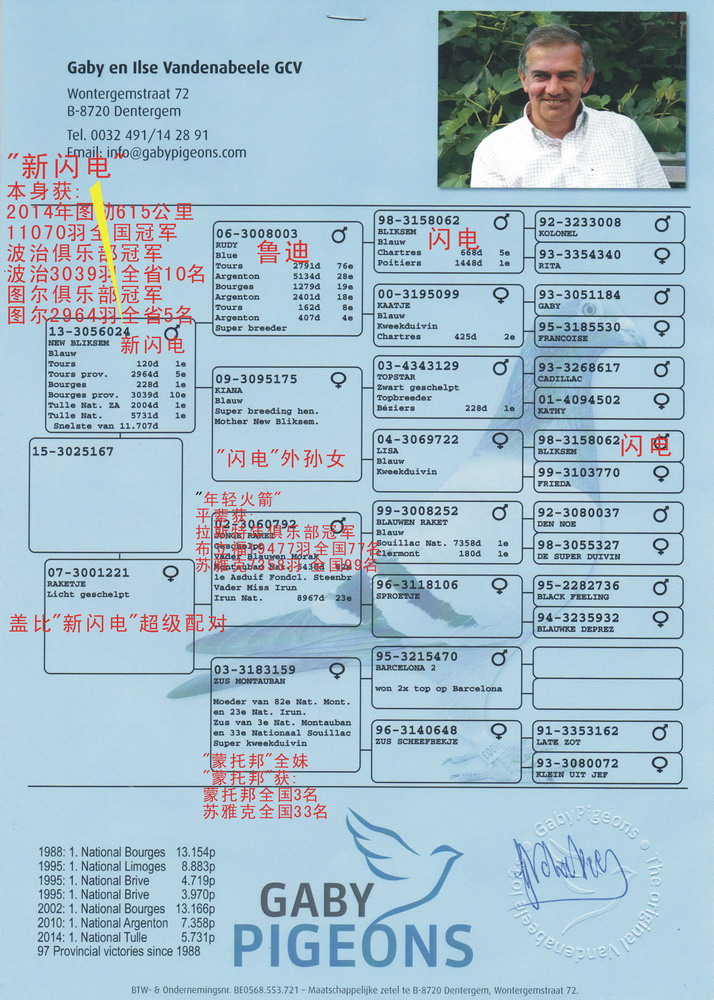 冠军鸽本身在2014年已经参加多场比赛,而且成绩骄人,已经2次俱乐部冠军,波治一岁鸽冠军以及杜尔斯一岁鸽冠军!