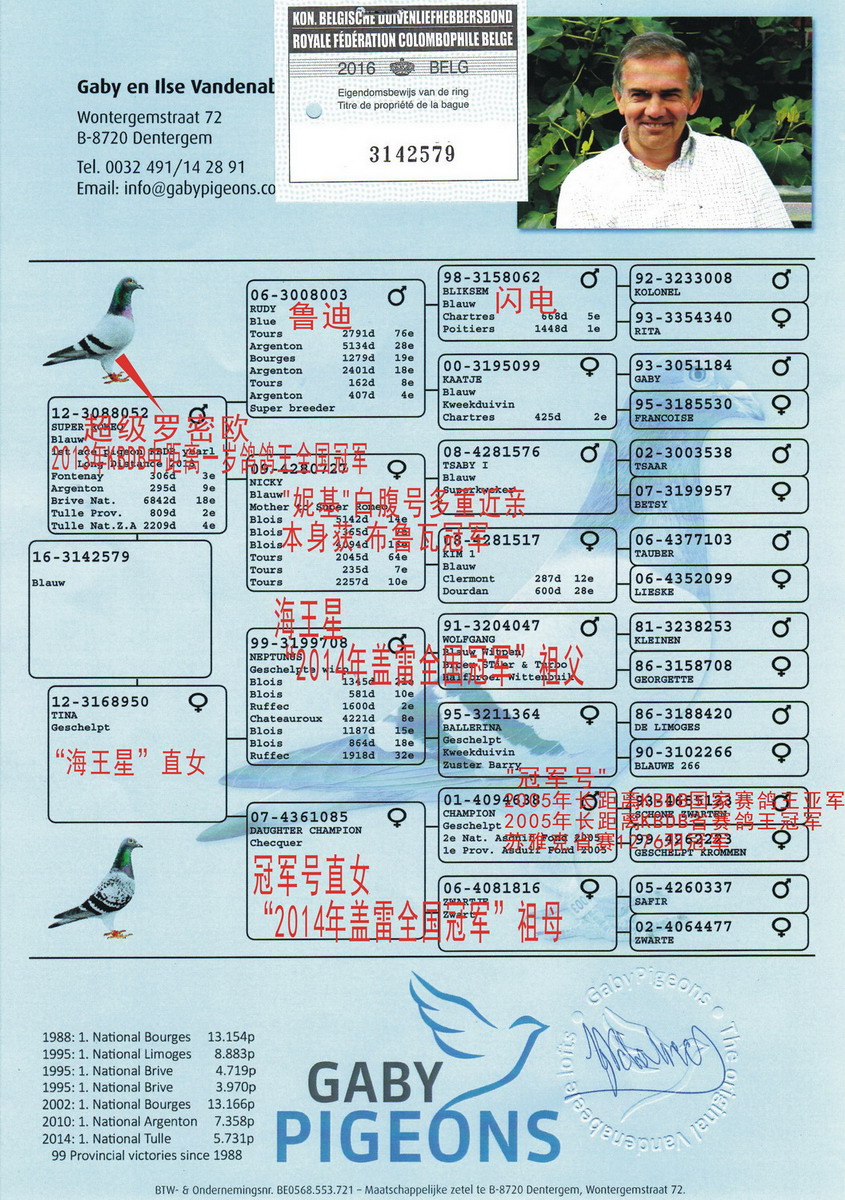 比利时赛鸽教父盖比,一岁鸽B13-3056024,勇夺一岁鸽冠军,11707羽总冠军!此鸽于当天下午14点37分57秒归巢,空距为614.934公里,分速为1342.8米/分。