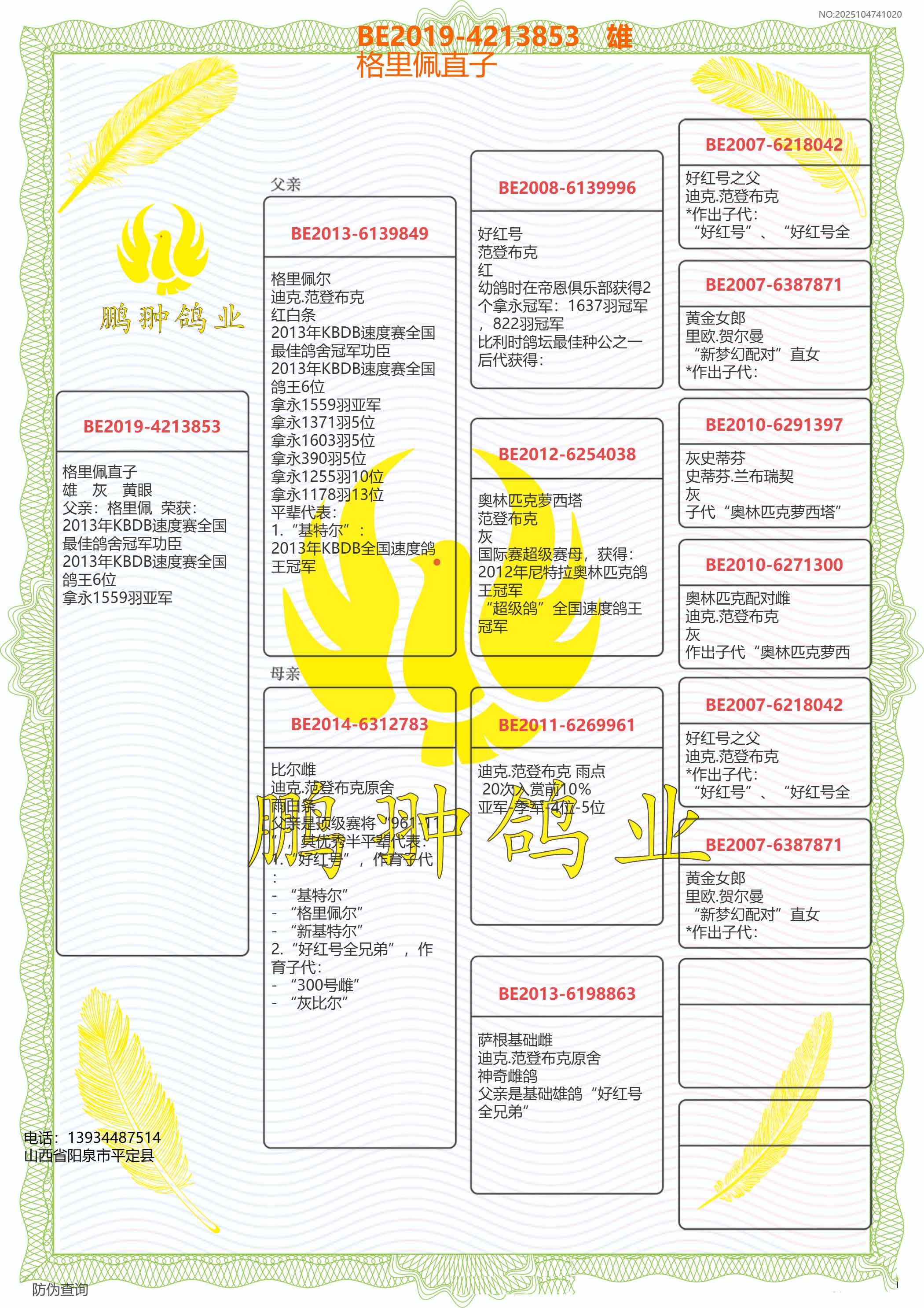 父亲:格里佩 荣获: 2013年KBDB速度赛全国最佳鸽舍冠军功臣 2013年KBDB速度赛全国鸽王6位 拿永1559羽亚军