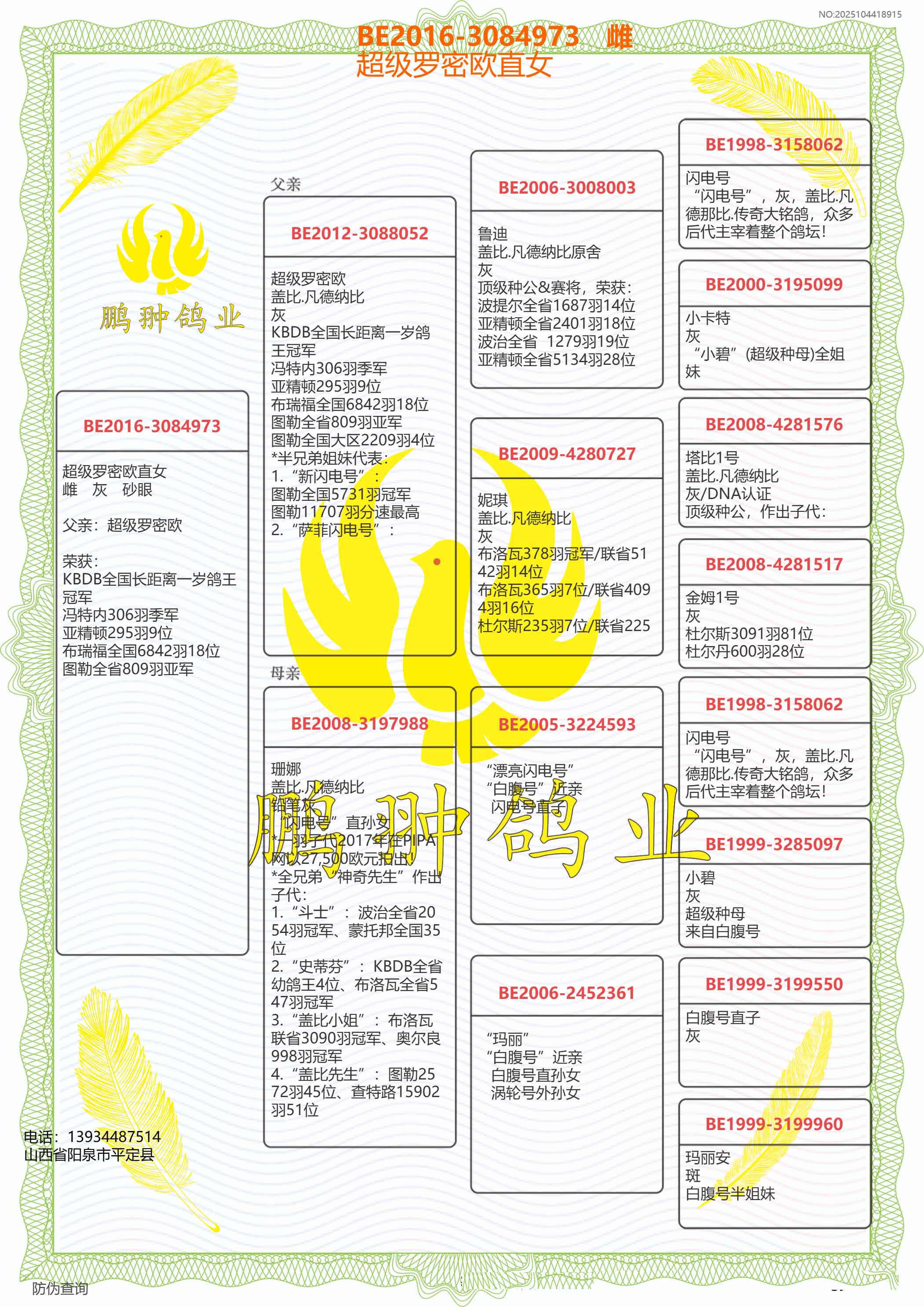 -“娇小号”为凡德纳比超级育种鸽,“娇小号”最优秀的直子代代表及佳绩: