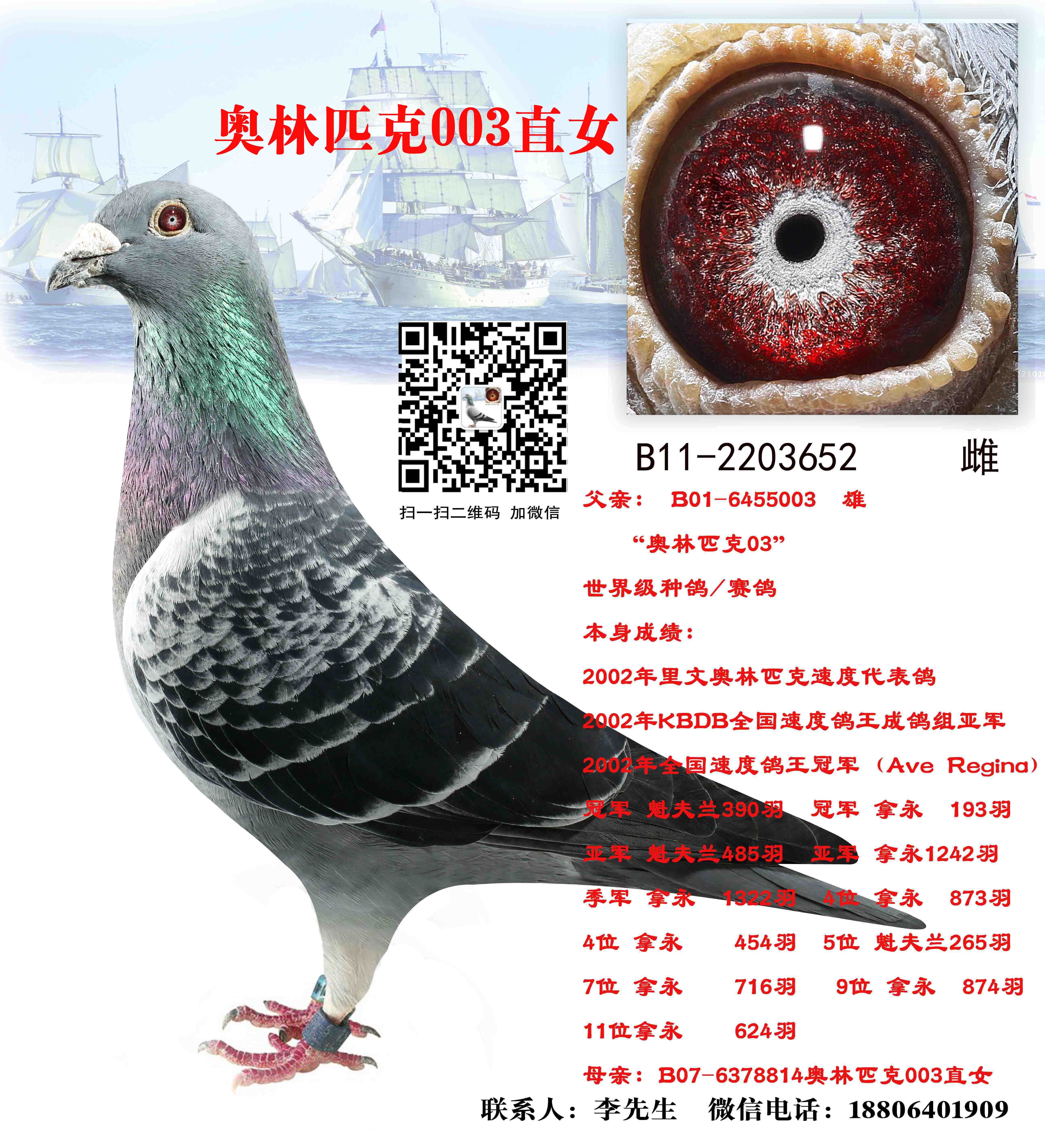 本身获得:2003年法国奥林匹克速度代表鸽