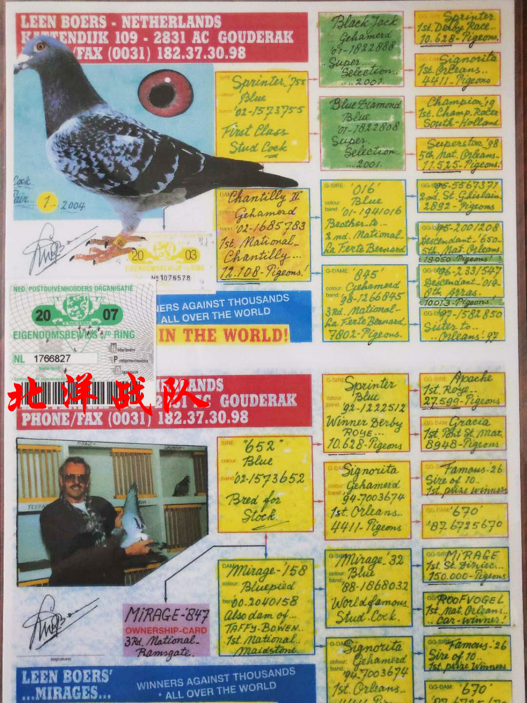 956的祖父本德尔12年KBDB全国大中距离鸽王冠军13年奥林匹克代表鸽王冠军