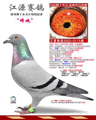 2022-0115 父亲:NL11-1407780 灰黄“小航海家” 优秀一岁龄赛将,141公里-664公里多次高位获奖 祖父“汤姆”获得2010年奥尔良全国冠军 2009年8省区长距离一岁鸽鸽王亚军 联合会长距离一岁鸽鸽王冠军 祖特芬联盟长距离鸽王冠军 母亲:BE11-4311217 灰黄“康达公主” 父亲“康达多”荣获2007年KBDB全省长距离鸽王冠军 出