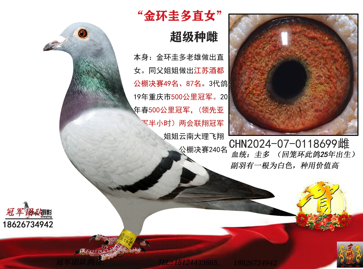 ***支援重庆鸽友朱亚军先生喜获2019年秋重庆市500公里冠军、2020春重庆开州区信鸽协会480公里决赛冠军,两区联翔冠军。领先亚军一个小时。本舍红阿比配圭多直孙。