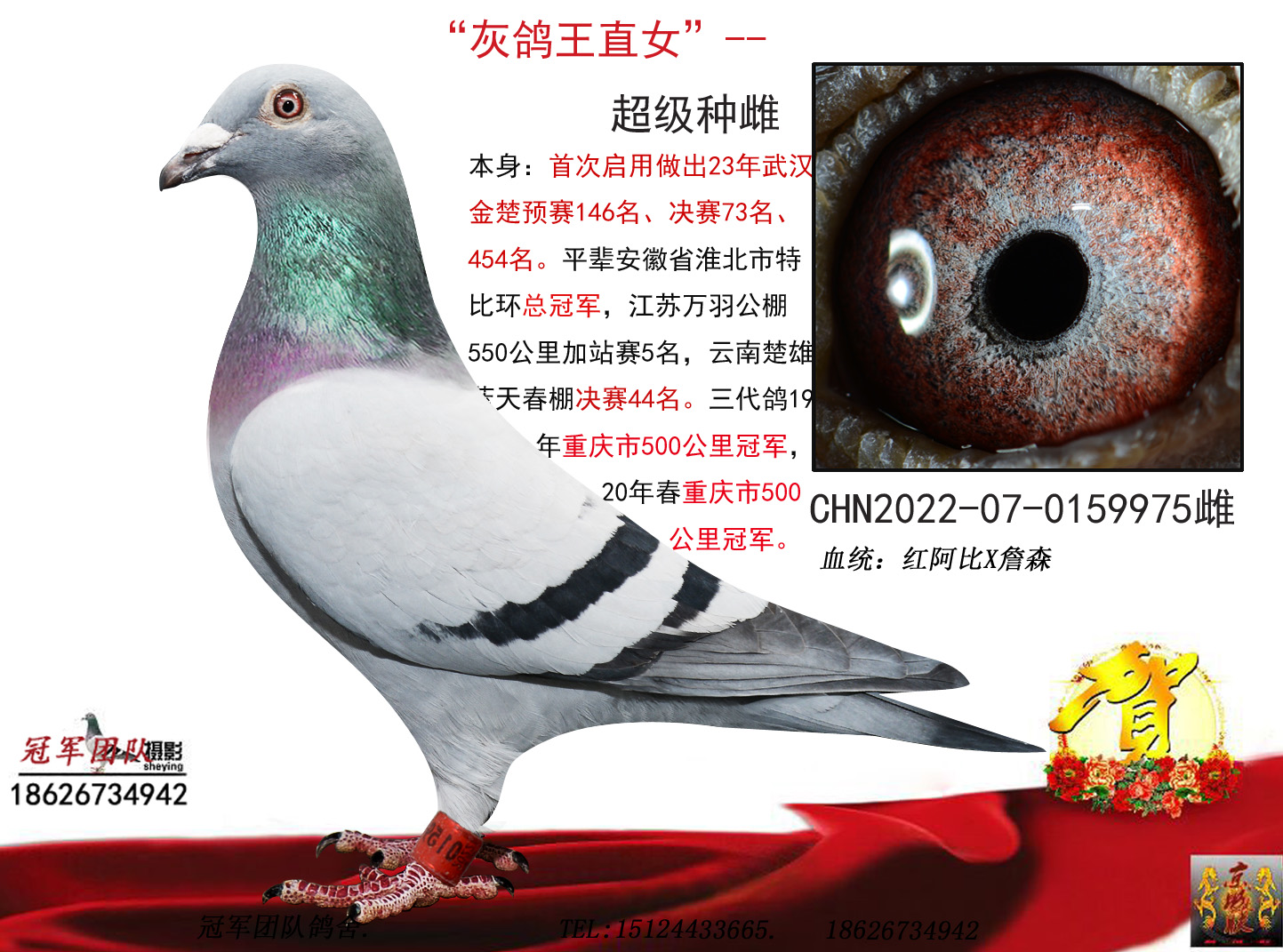 ***支援重庆鸽友朱亚军先生喜获2019年秋重庆市500公里冠军、2020春重庆开州区信鸽协会480公里决赛冠军,两区联翔冠军。领先亚军一个小时。本舍红阿比配圭多直孙。