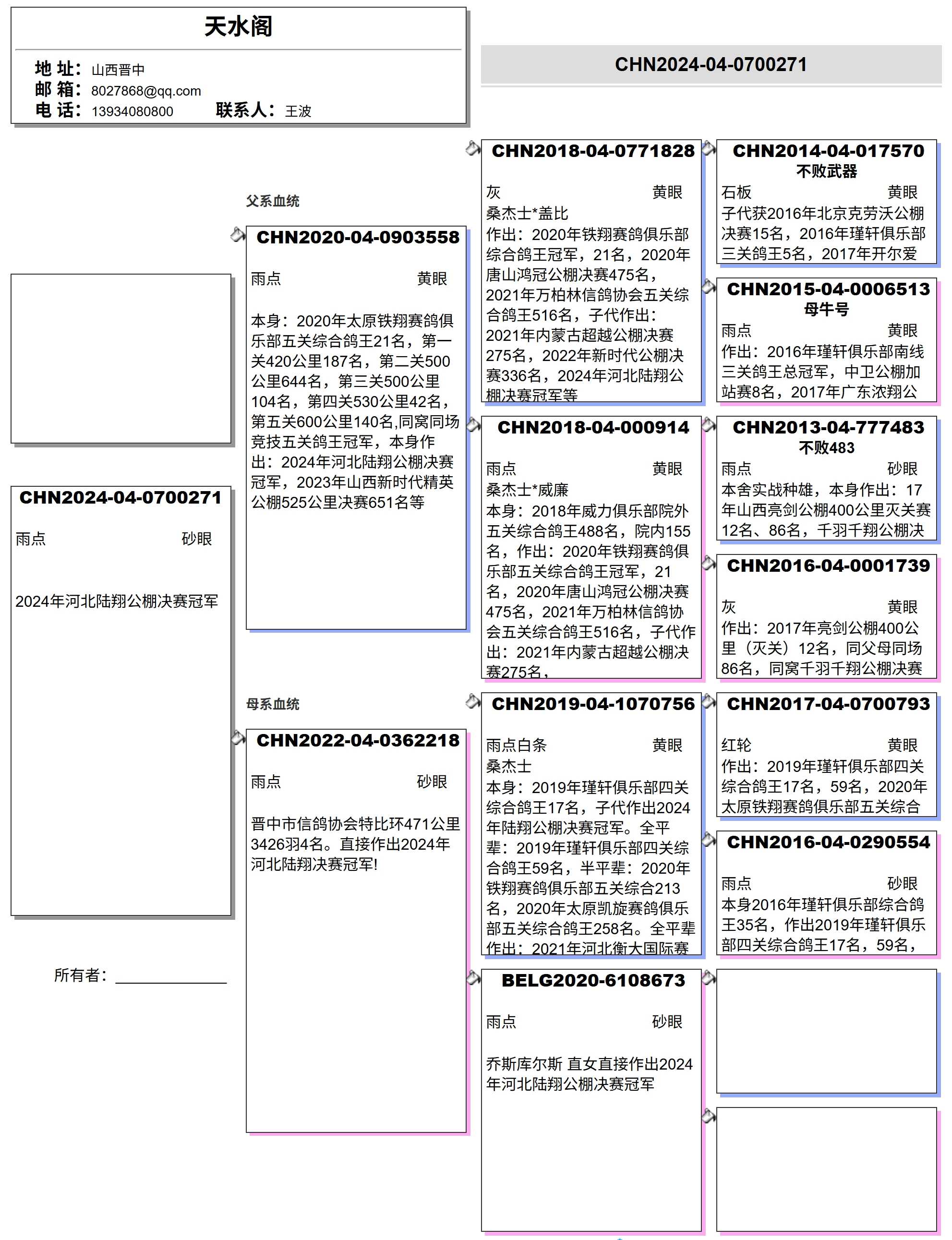 父系:不败武器配天水阁母牛号直孙,本身太原铁翔赛鸽俱乐部五关综合鸽王28名,